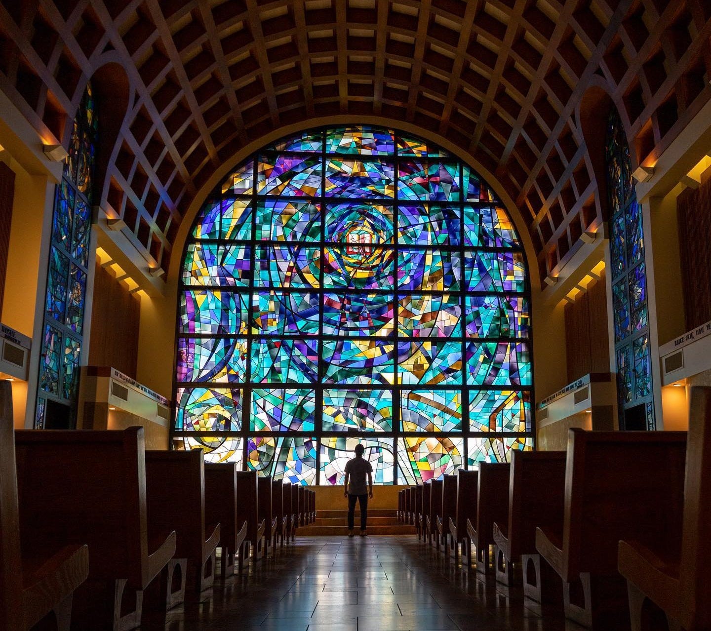The most celebrated windows on Pepperdine’s Malibu campus, however, were not designed by Pereira. They are the giant stained-glass windows of the Stauffer Chapel, which were designed by the husband-and-wife team of Robert and Bette Donovan, professional stained-glass artists who took for their theme the Tree of Life. The project was forever regarded as their masterpiece.