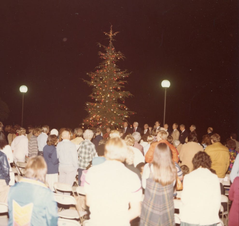 In 1980, Pepperdine invited the Malibu community to campus to celebrate the lighting of a Christmas tree that had been jointly given to the university by the Optimist Club and the Adamson family (the Malibu landowners who had donated the Malibu land to Pepperdine in 1968). The tree was a 25-foot deodar cedar planted near the theme tower parking lot. A plaque nearby commemorated the dedication of the tree, naming it “Christmas in America.”1 The crowd gathered at dusk to sing carols and to hear from president Howard A. White and chancellor M. Norvel Young. The tree lighting ceremony became a tradition that was repeated in subsequent years.